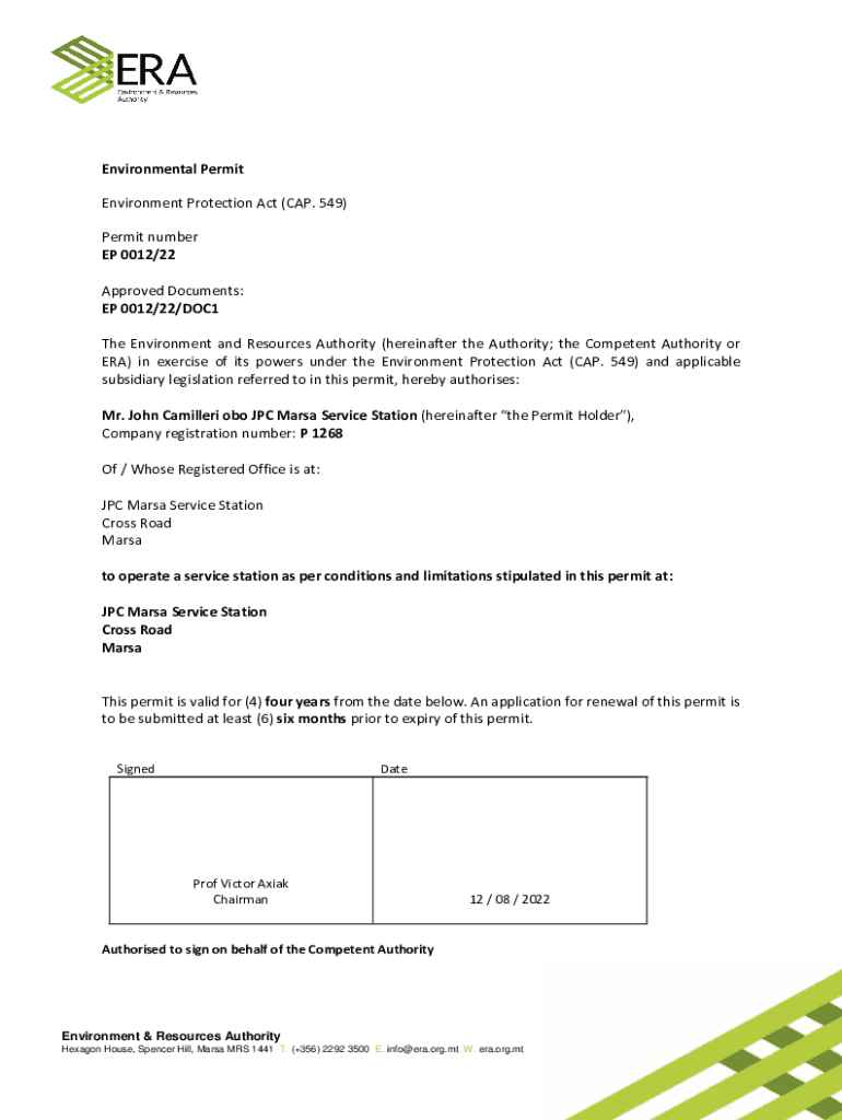 Environmental Permit Environment Protection Act (CAP. 549) Permit number EP 0012/22 Approved Documents: EP 0012/22/DOC1 The Environment and Resources Authority (hereinafter the Authority; the Competent