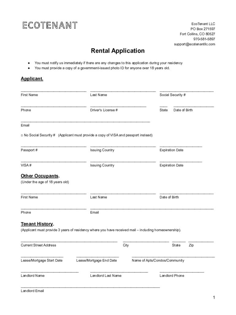 Covenant LLC PO Box 271597 Fort Collins, CO 80527 9705815897 support@ecotenantllc.comRental Application You must notify us immediately if there are any changes to this application during your residency