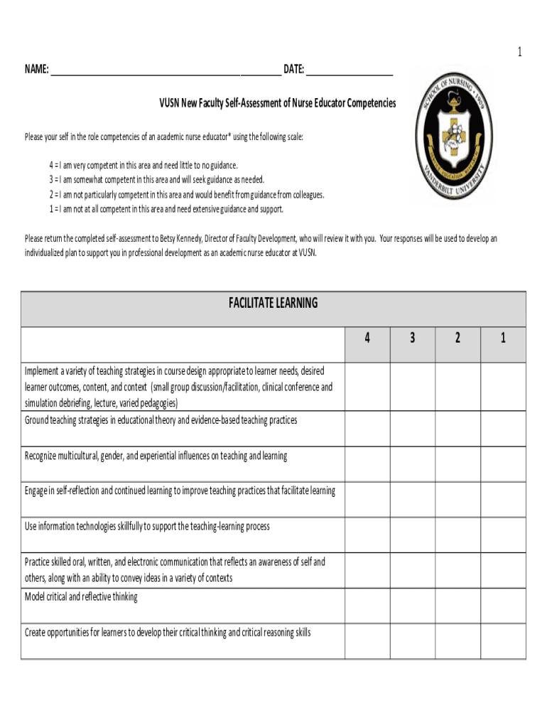 NAME: ___ DATE: ___USN New Faculty Reassessment of Nurse Educator Competencies1Please your self in the role competencies of an academic nurse educator* using the following scale:4 I am very competent