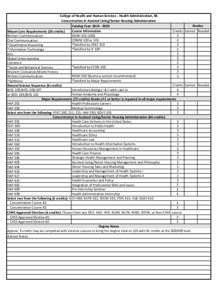 College of Health and Human Services Health Administration, BS Concentration in Assisted Living/Senior Housing Administration Grades Catalog Year: 2019 2020 Course Information Credits Earned Needed