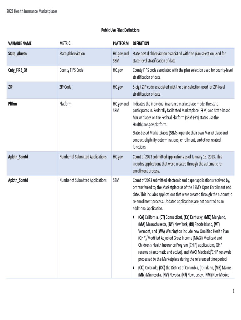 2023 Health Insurance Marketplaces Public Use Files: Definitions VARIABLE NAMEMETRICPLATFORMDEFINITIONState_AbrvtnState Abbreviation.gov and State postal abbreviation associated with the plan selection