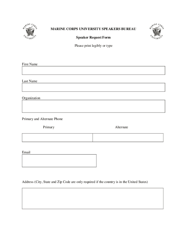 MARINE CORPS UNIVERSITY SPEAKERS BUREAU Speaker Request Form Please print legibly or typecast Nameless NameOrganizationPrimary and Alternate Phone PrimaryAlternateEmailAddress (City, State and Zip