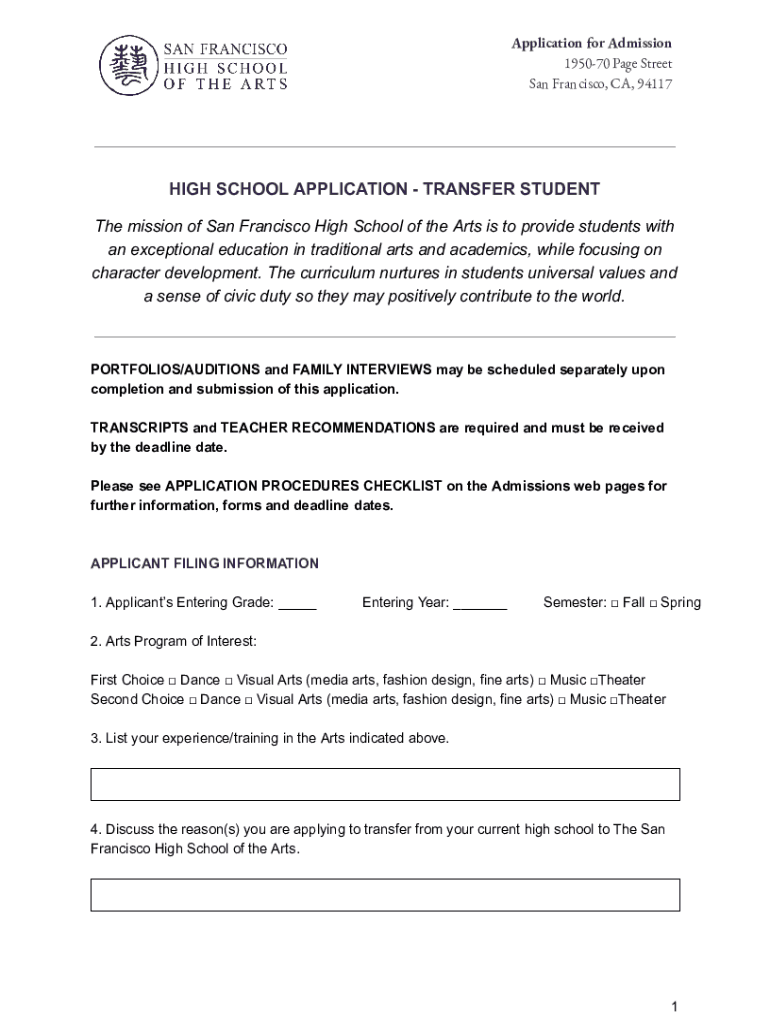 Application for Admission 195070-Page Street San Francisco, CA, 94117HIGH SCHOOL APPLICATION TRANSFER STUDENT The mission of San Francisco High School of the Arts is to provide students with an exceptional