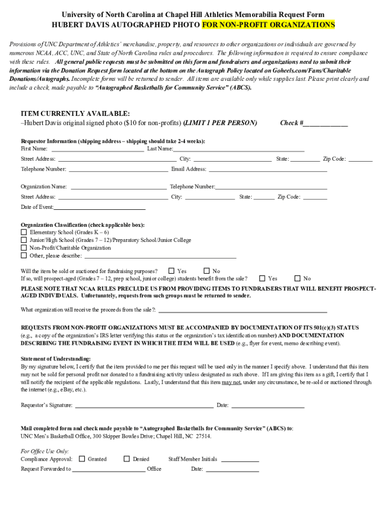 University of North Carolina at Chapel Hill Athletics Memorabilia Request Form HUBERT DAVIS AUTOGRAPHED PHOTO FOR NONPROFIT ORGANIZATIONS Provisions of UNC Department of Athletics merchandise, property,