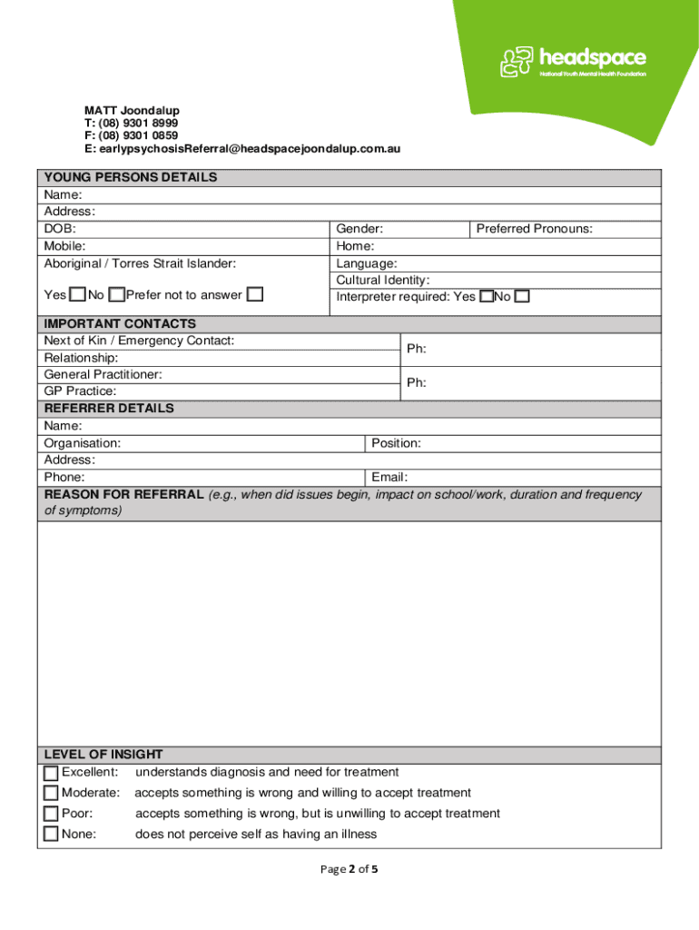 MATT Joondalup T: (08) 9301 8999 F: (08) 9301 0859 E: earlypsychosisReferral@headspacejoondalup.com.auheadspace Early Psychosis Referral Form headspace Early Psychosis is a comprehensive, early intervention