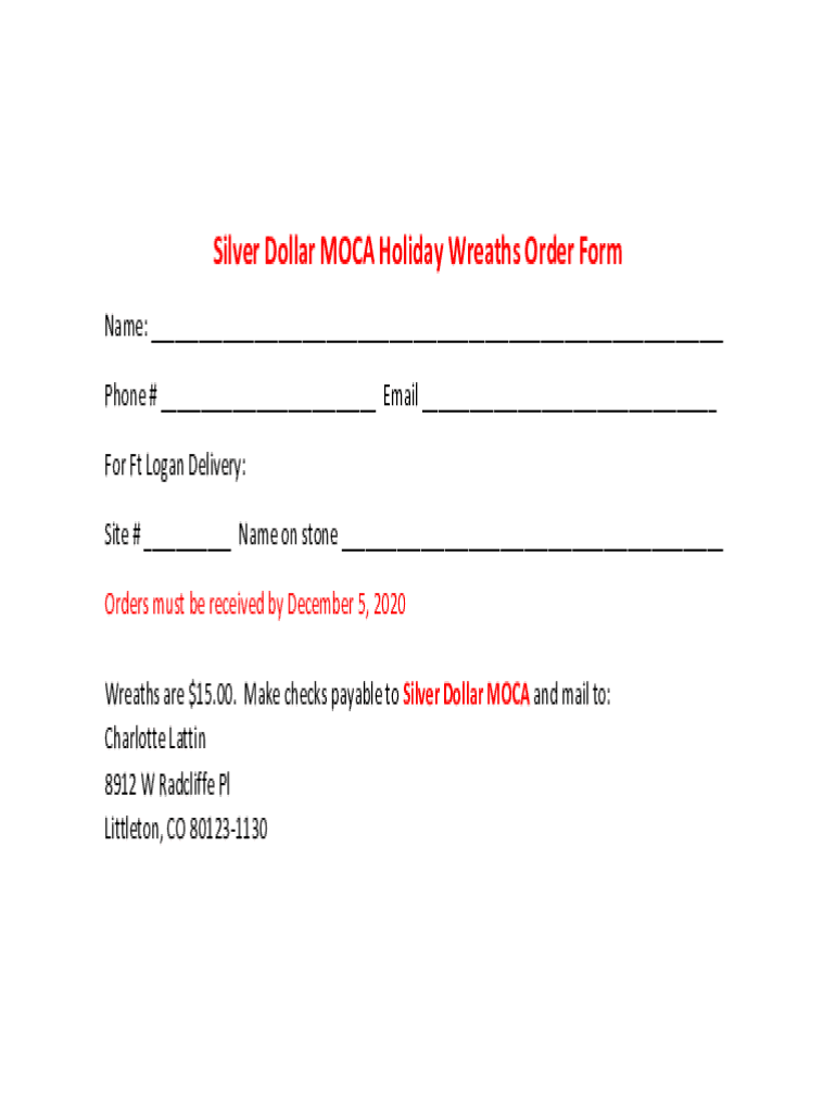 Silver Dollar MOCK Holiday Wreaths Order Form Name: ___ Phone # ___ Email ___ For Ft Logan Delivery: Site # ___ Name on stone ___ Orders must be received by December 5, 2020, Wreaths are $15.00. Make