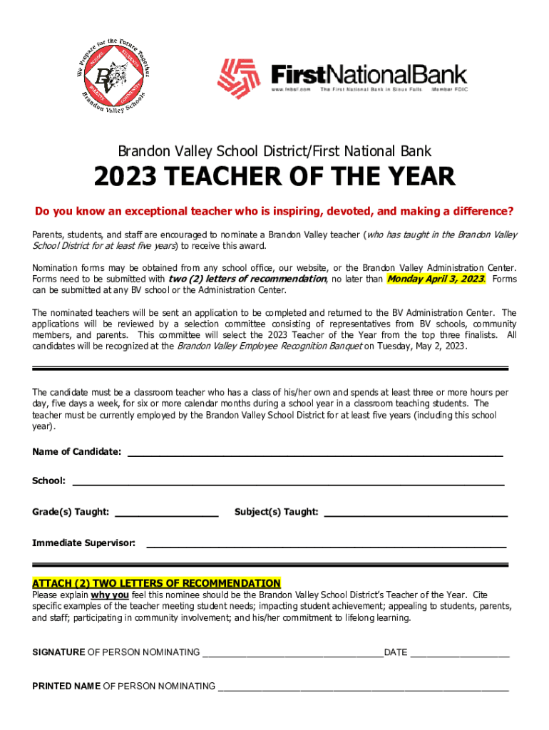 Brandon Valley School District/First National Bank2023 TEACHER OF THE YEAR Do you know an exceptional teacher who is inspiring, devoted, and making a difference? Parents, students, and staff are encouraged