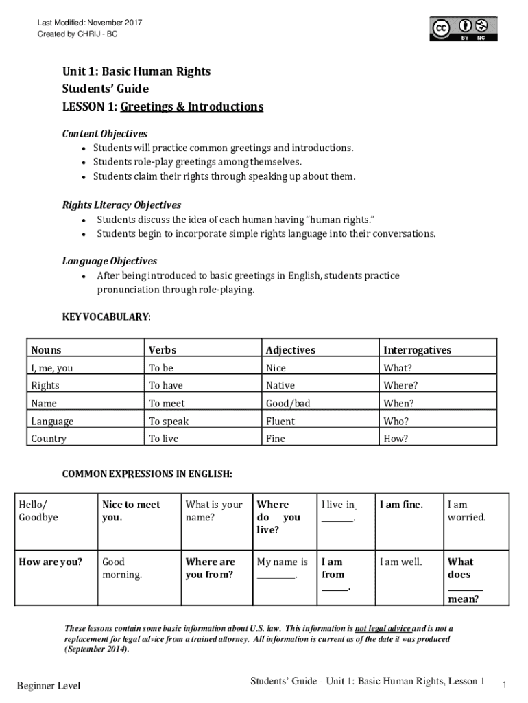 Last Modified: November 2017 Created by CHRIS BCU nit 1: Basic Human Rights Students Guide LESSON 1: Greetings & Introductions Content Objectives Students will practice common greetings and introductions.