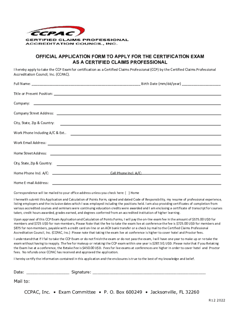 OFFICIAL APPLICATION FORM TO APPLY FOR THE CERTIFICATION EXAM AS A CERTIFIED CLAIMS PROFESSIONAL I hereby apply to take the CCP Exam for certification as a Certified Claims Professional (CCP) by the