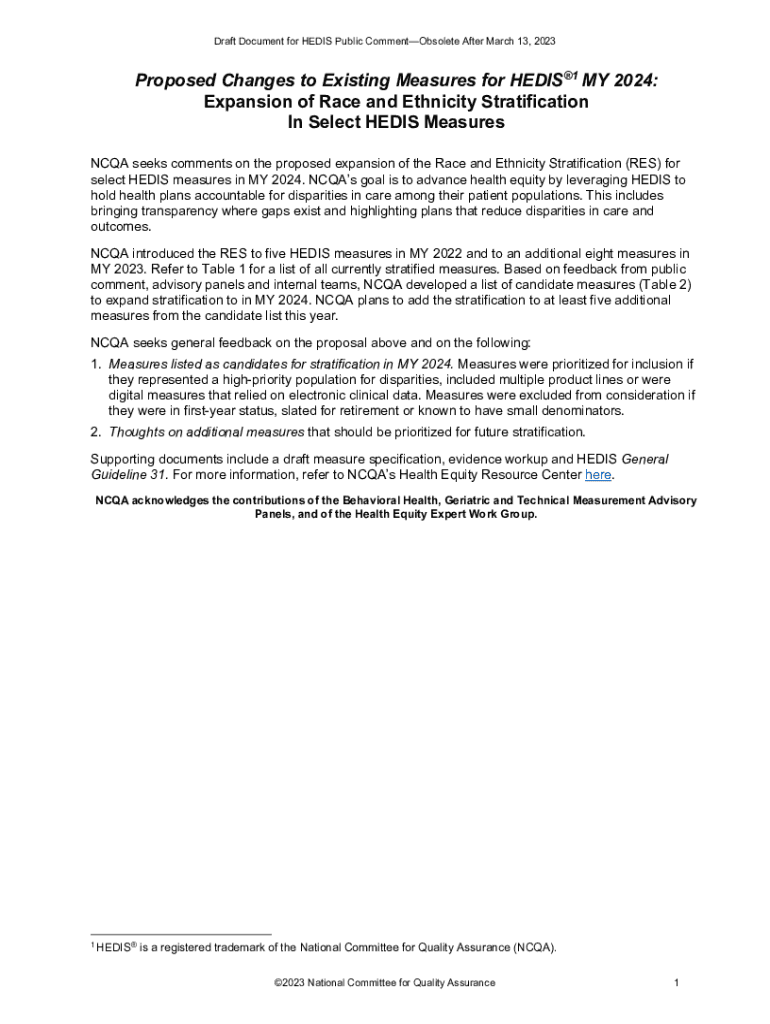 Draft Document for FEDIS Public CommentObsolete After March 13, 2023Proposed Changes to Existing Measures for HEDIS1 MY 2024: Expansion of Race and Ethnicity Stratification In Select FEDIS Measures