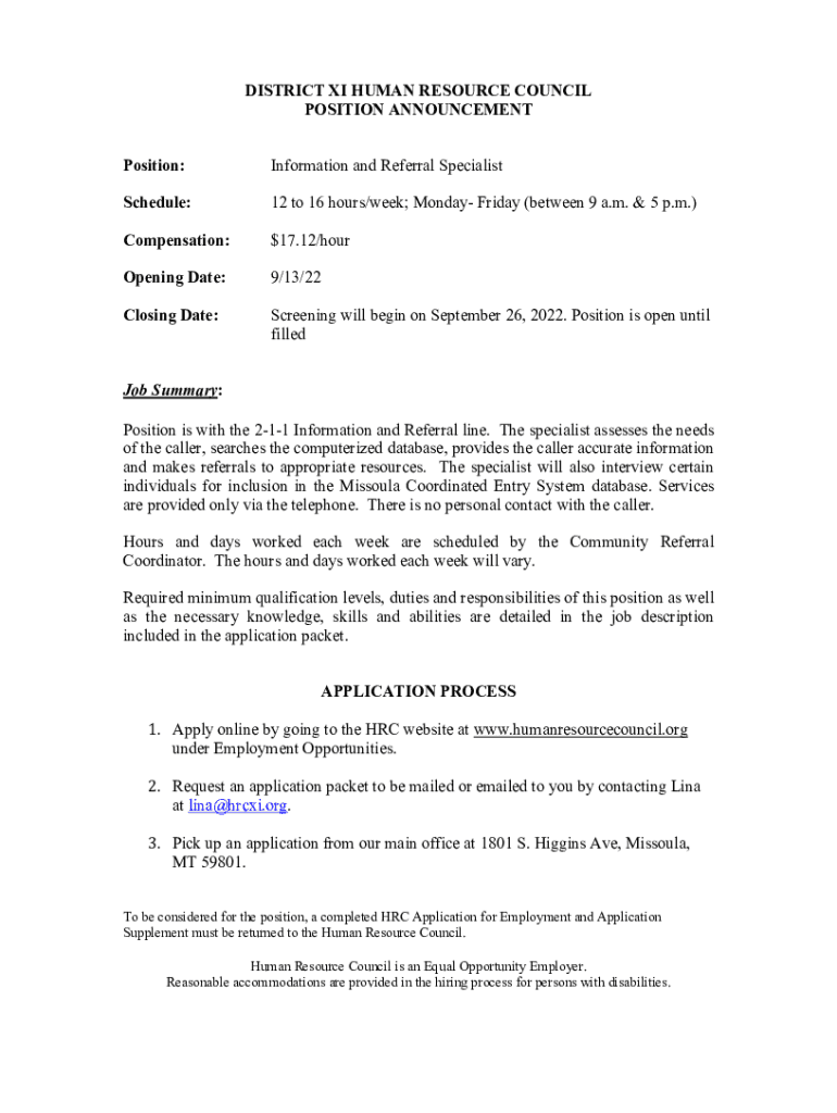 Position:Information and Referral SpecialistSchedule:12 to 16 hours/week; Monday Friday (between 9 a.m. & 5 p.m.) Compensation:$17.12/hourOpening