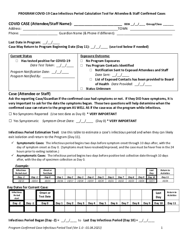 PROGRAM COVID-19 Case Infectious Period Calculation Tool for Attendee & Staff Confirmed Cases COVID-19 CASE (Attendee/Staff Name): ___DOB __/__/___ Group/Class ___Address: ___TOWN ___ Phone: ___ Guardian