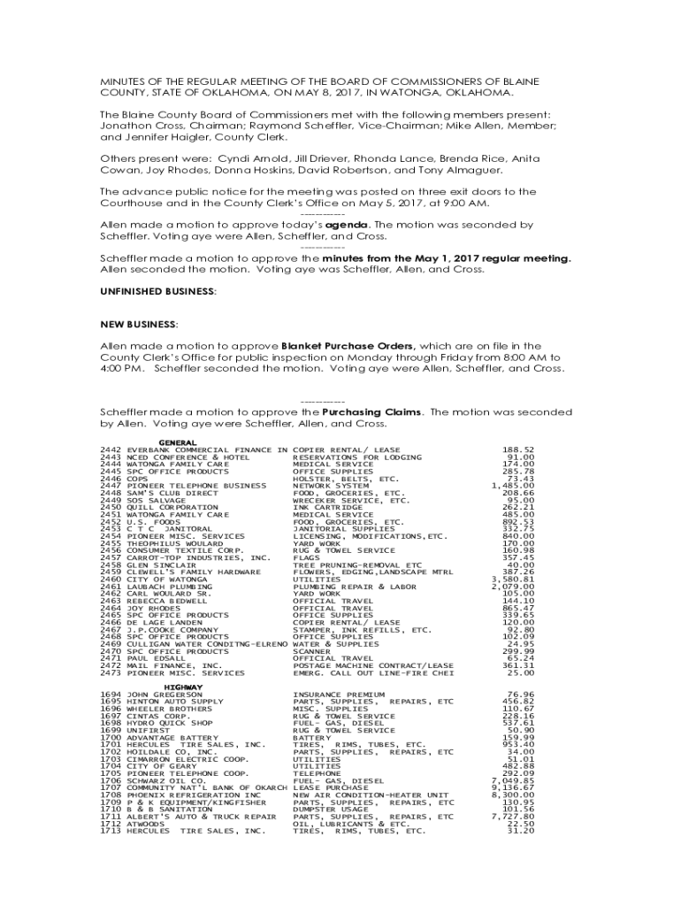 MINUTES OF THE REGULAR MEETING OF THE BOARD OF COMMISSIONERS OF BLAINE COUNTY, STATE OF OKLAHOMA, ON MAY 8, 2017, IN TONGA, OKLAHOMA. The Blaine County Board of Commissioners met with the following