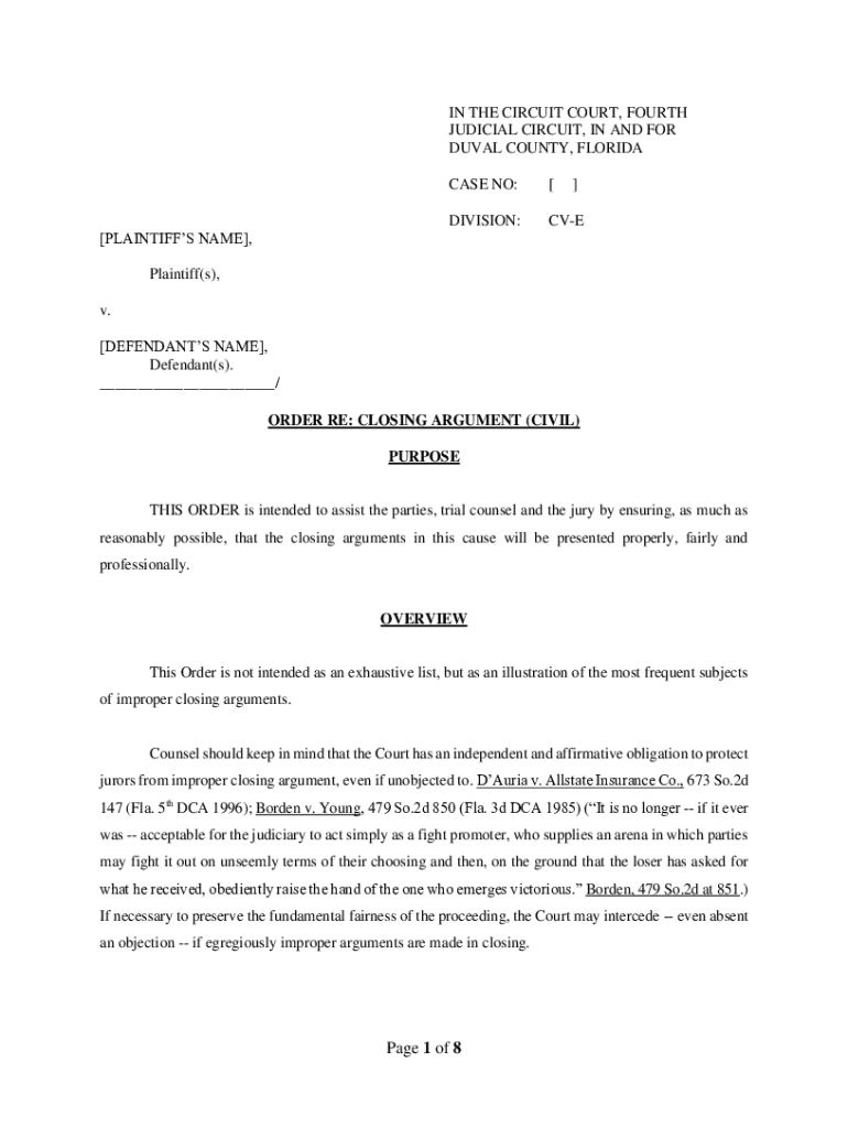 IN THE CIRCUIT COURT, FOURTH JUDICIAL CIRCUIT, IN AND FOR DUVAL COUNTY, FLORIDA CASE NO:[]DIVISION:CVE[PLAINTIFFS NAME], Plaintiff(s), v. [DEFENDANTS NAME], Defendant(s). ___/ ORDER RE: CLOSING ARGUMENT