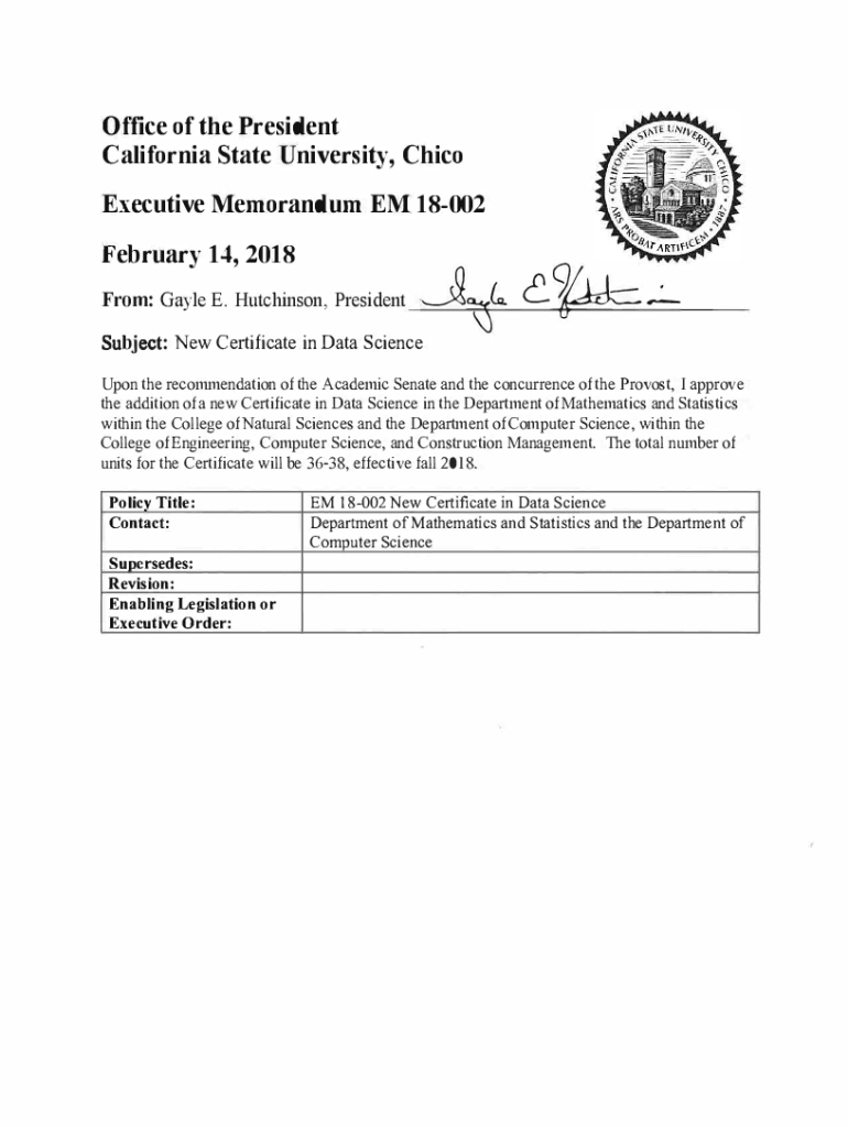 Office of the President California State University, Chico Executive Memorandum EM 18002 February 14, 2018, From: Gayle E. Hutchinson, President\'ts(, ._ ....:_Subject: New Certificate in Data ScienceUpon