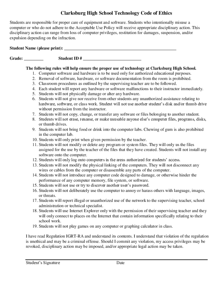Clarksburg High School Technology Code of Ethics Students are responsible for proper care of equipment and software. Students who intentionally misuse a computer or who do not adhere to the Acceptable