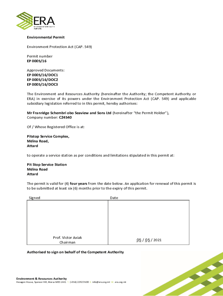 Environmental Permit Environment Protection Act (CAP. 549) Permit number EP 0005/16 Approved Documents: EP 0005/16/DOC1 EP 0005/16/DOC2 EP 0005/16/DOC3 The Environment and Resources Authority (hereinafter
