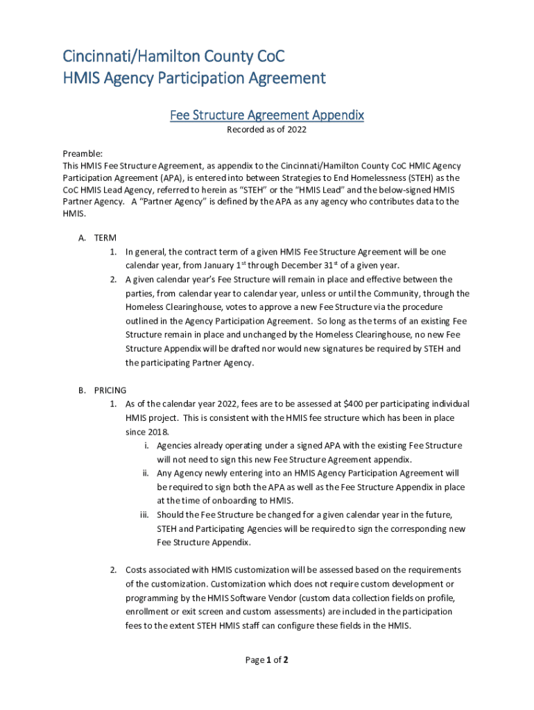 Cincinnati/Hamilton County COC HIS Agency Participation Agreement Fee Structure Agreement Appendix Recorded as of 2022 Preamble: This HIS Fee Structure Agreement, as appendix to the Cincinnati/Hamilton