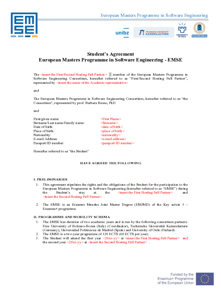 European Masters Program in Software EngineeringStudents Agreement European Masters Program in Software Engineering ELSE The insert the First/Second Hosting Full Partner member of the European Masters