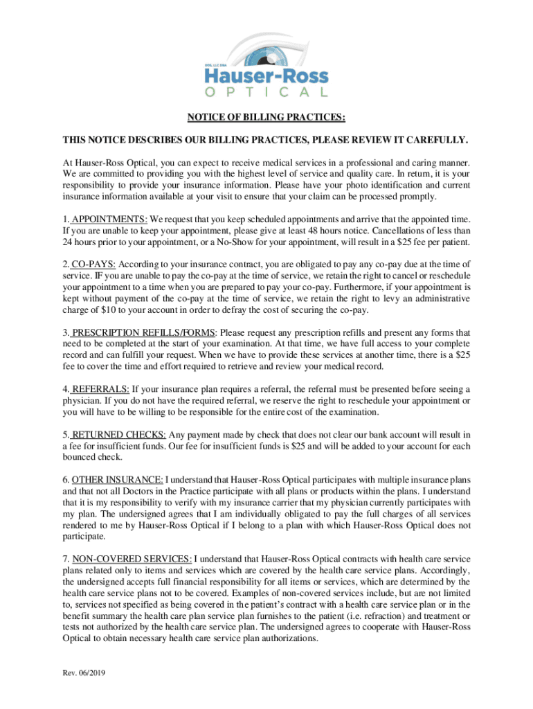 NOTICE OF BILLING PRACTICES: THIS NOTICE DESCRIBES OUR BILLING PRACTICES, PLEASE REVIEW IT CAREFULLY. At Housedress Optical, you can expect to receive medical services in a professional and caring