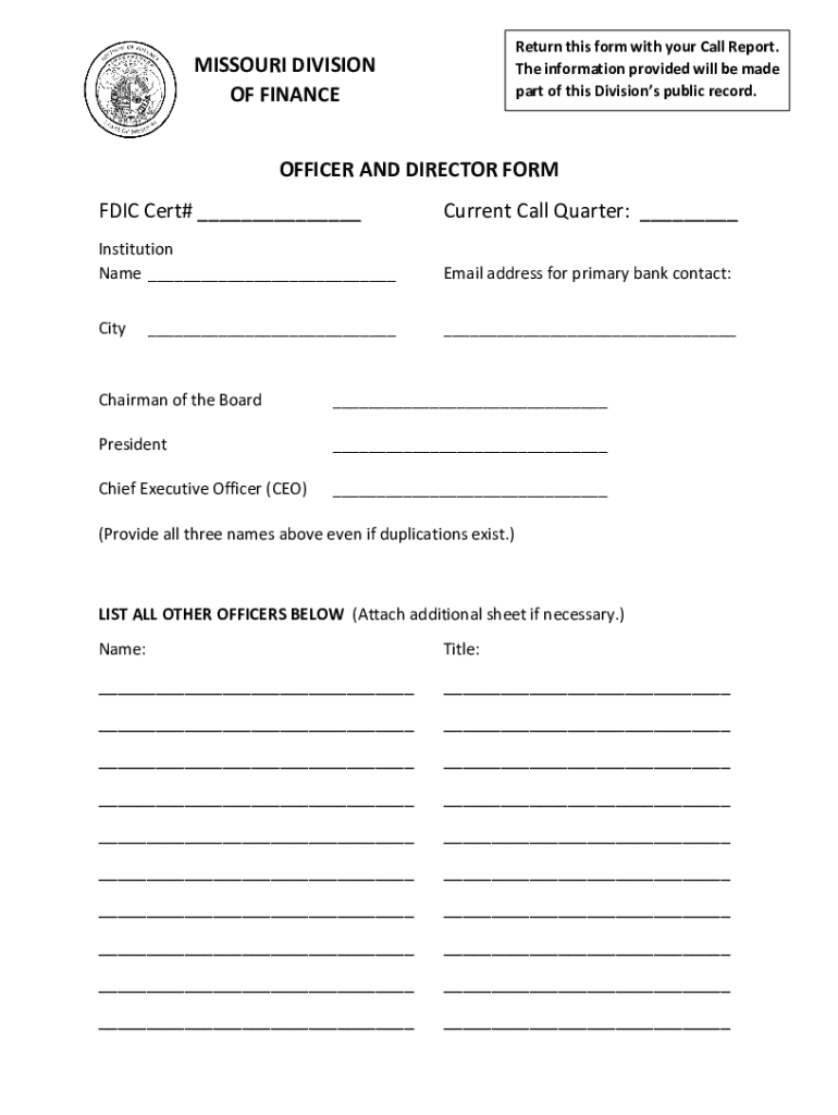 Return this form with your Call Report. The information provided will be made part of these Divisions public record. MISSOURI DIVISION OF FINANCEOFFICER AND DIRECTOR FORM FDIC Cert# ___Current Call