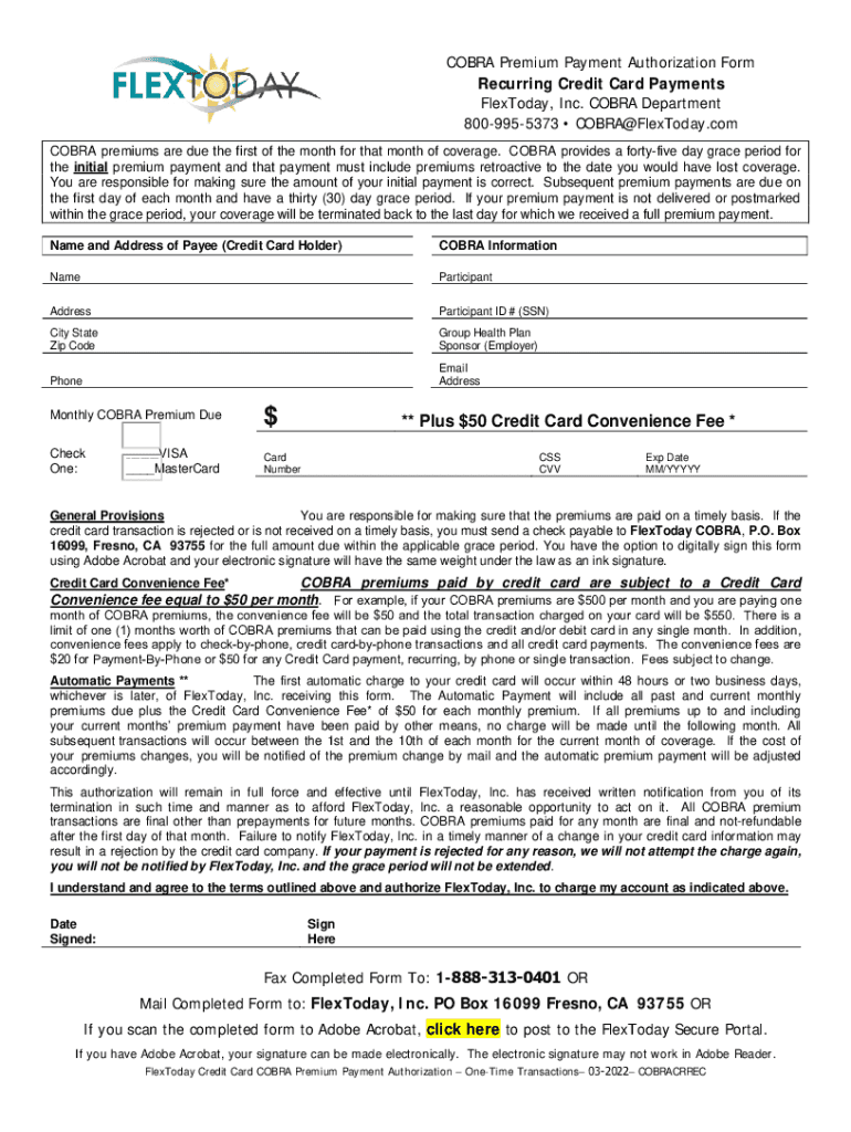 COBRA Premium Payment Authorization Form Recurring Credit Card Payments FlexToday, Inc. COBRA Department 8009955373 COBRA@FlexToday.com COBRA premiums are due the first of the month for that month