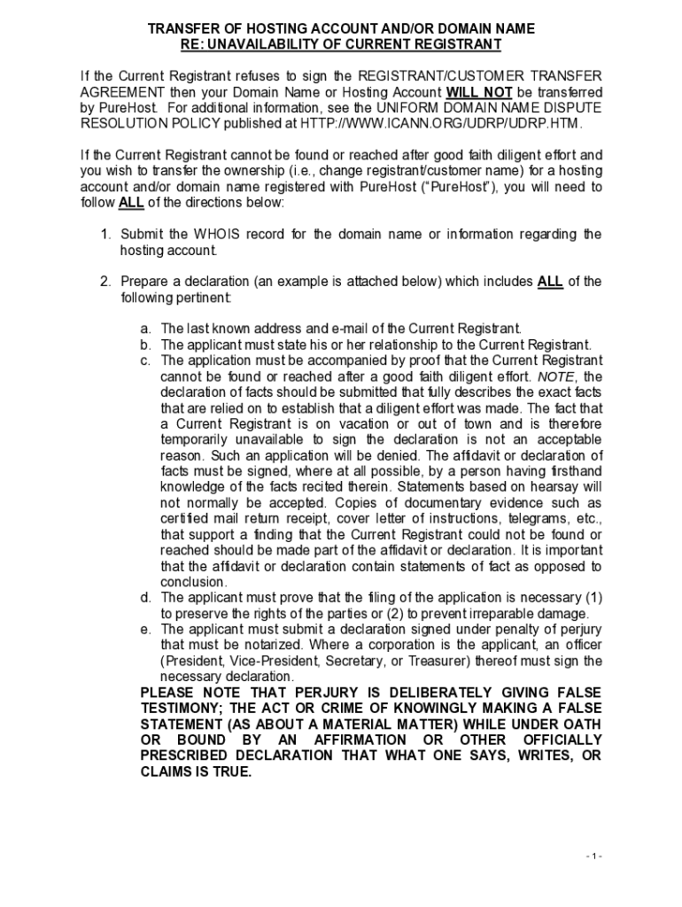 TRANSFER OF HOSTING ACCOUNT AND/OR DOMAIN NAME RE: UNAVAILABILITY OF CURRENT REGISTRANT If the Current Registrant refuses to sign the REGISTRANT/CUSTOMER TRANSFER AGREEMENT then your Domain Name or