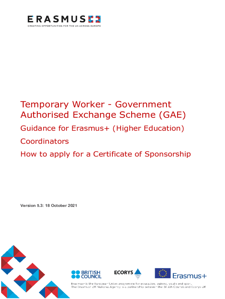 Temporary Worker Government Authorized Exchange Scheme (GAE) Guidance for Erasmus+ (Higher Education) Coordinators How to apply for a Certificate of SponsorshipVersion 5.3: 18 October 2021Overview