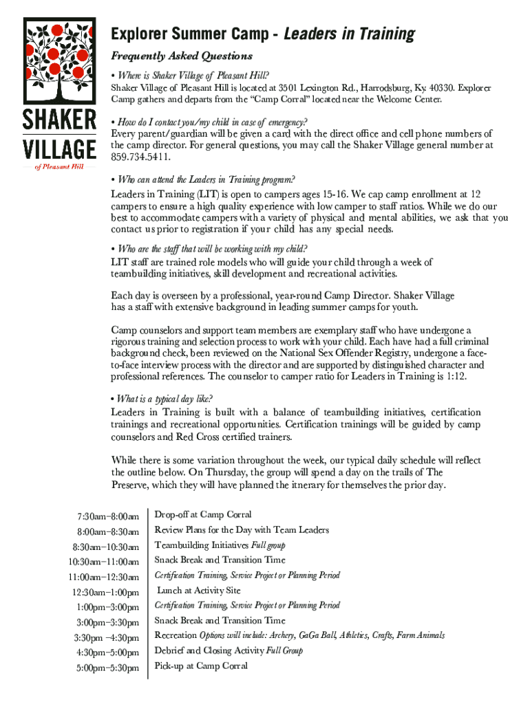 Explorer Summer Camp Leaders in Training Frequently Asked Questions Where is Shaker Village of Pleasant Hill? Shaker Village of Pleasant Hill is located at 3501 Lexington Rd., Harrods burg, Ky. 40330.
