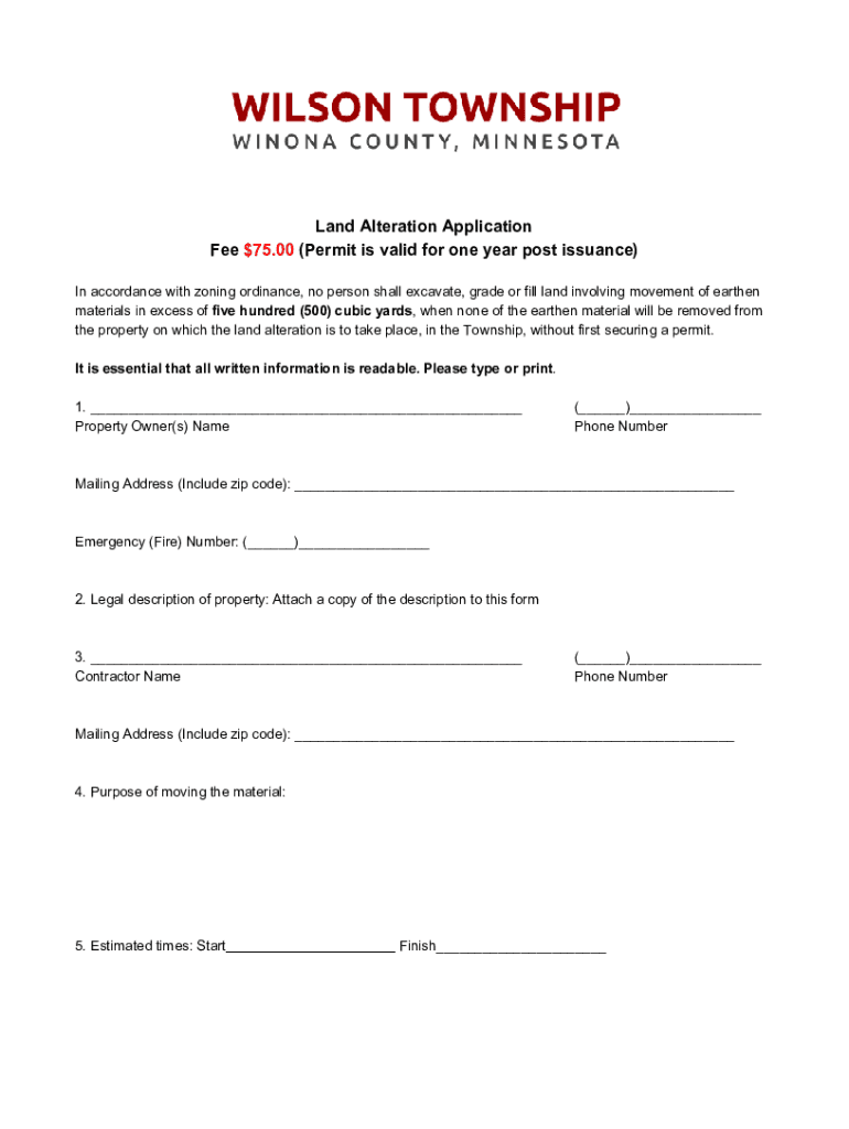 Get the free Land Alteration Application Fee $75.00 (Permit is valid for ...
