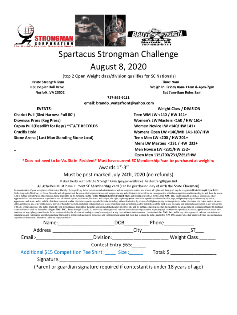 Spartacus Strongman Challenge August 8, 2020 (top 2 Open Weight class/division qualifies for SC Nationals) Brute Strength Gym 836 Poplar Hall Drive Norfolk, VA 23502Time: 9am Weigh In: Friday 8am11am