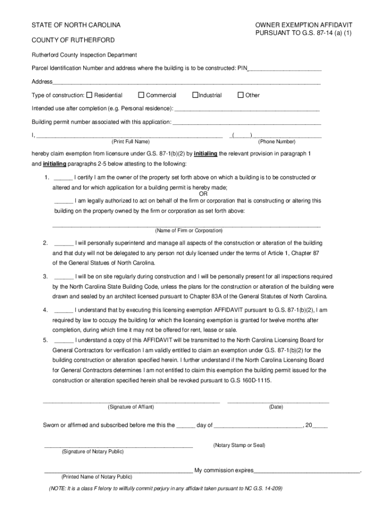 STATE OF NORTH CAROLINAOWNER EXEMPTION AFFIDAVIT PURSUANT TO G.S. 8714 (a) (1)COUNTY OF Rutherford County Inspection Department Parcel Identification Number and address where the building is to be