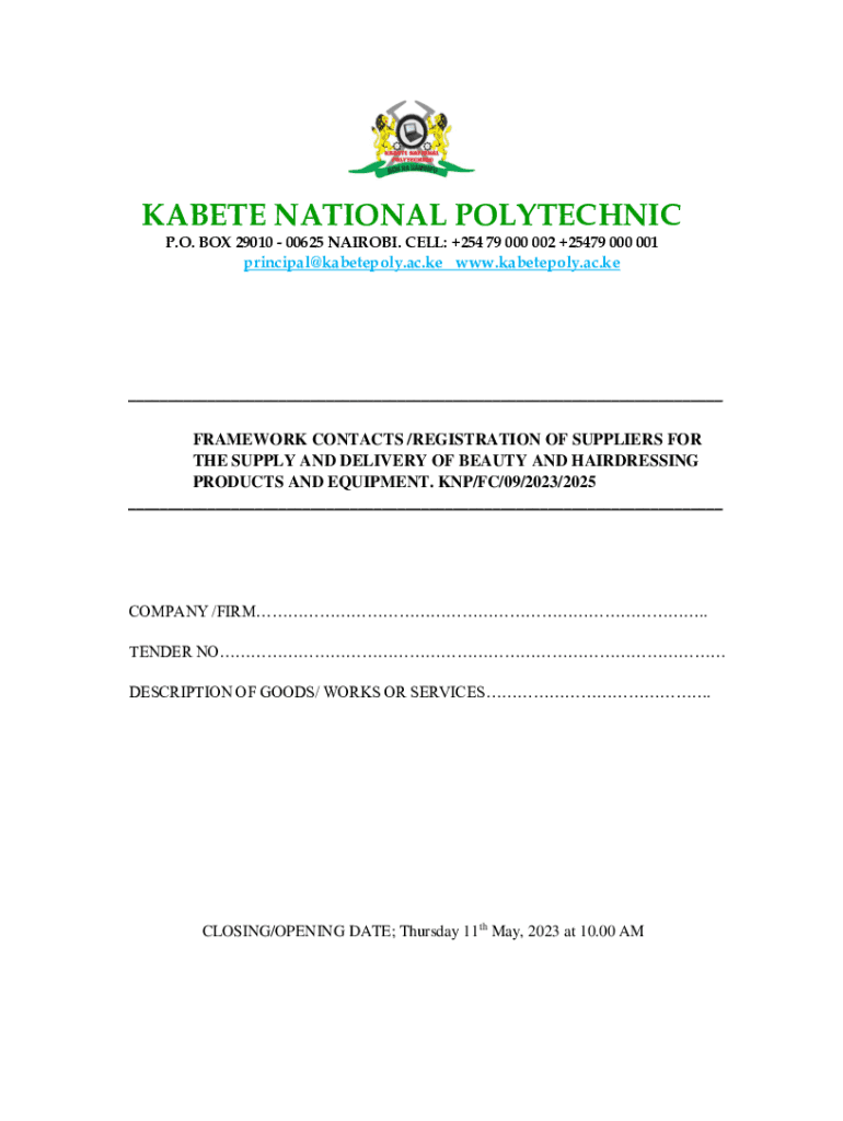 KATE NATIONAL POLYTECHNIC P.O. BOX 29010 00625 NAIROBI. CELL: +254 79 000 002 +25479 000 001 principal@kabetepoly.ac.ke www.kabetepoly.ac.ke___FRAMEWORK CONTACTS /REGISTRATION OF SUPPLIERS FOR THE