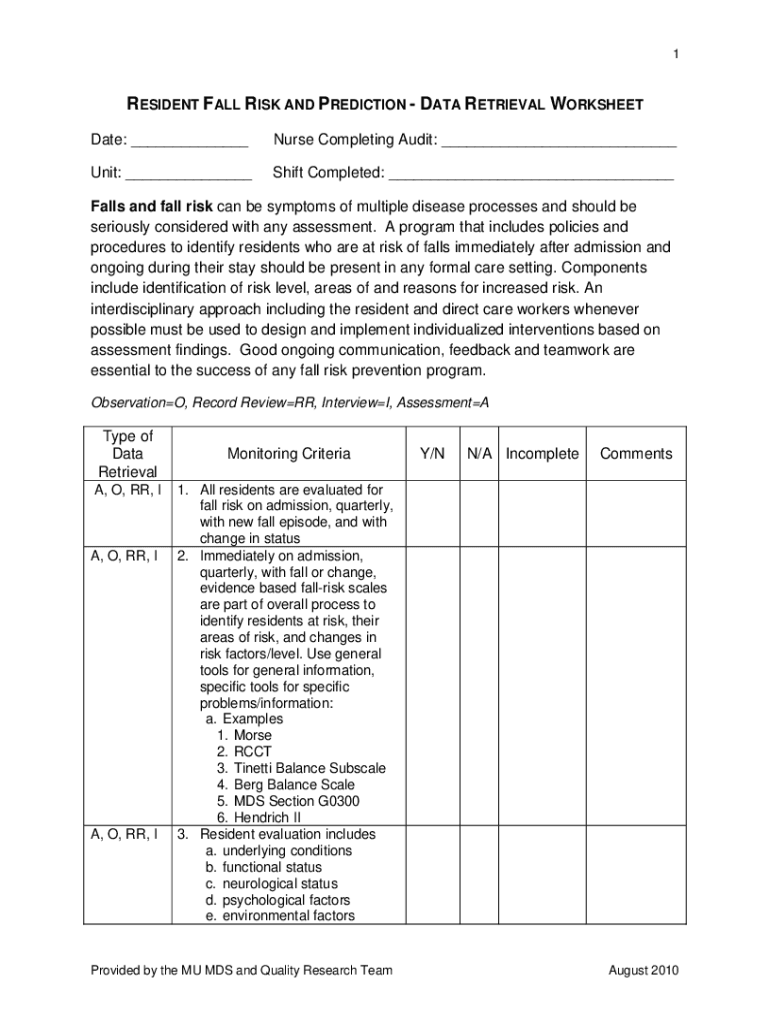 1RESIDENT FALL RISK AND PREDICTION DATA RETRIEVAL WORKSHEET Date: ___Nurse Completing Audit: ___Unit: ___Shift Completed: ___Falls and fall risk can be symptoms of multiple disease processes and should