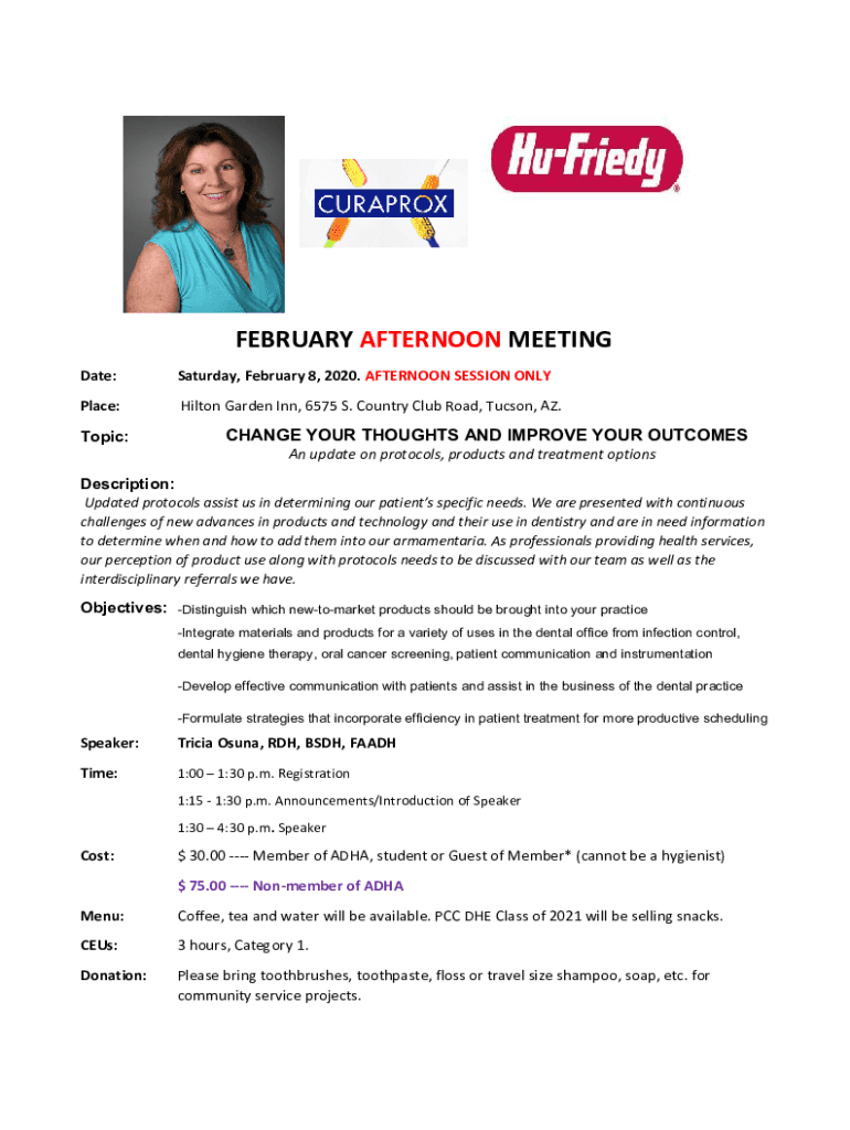 FEBRUARY AFTERNOON MEETING Date:Saturday, February 8, 2020. AFTERNOON SESSION Anyplace:Hilton Garden Inn, 6575 S. Country Club Road, Tucson, AZ. Topic:CHANGE YOUR THOUGHTS AND IMPROVE YOUR OUTCOMES