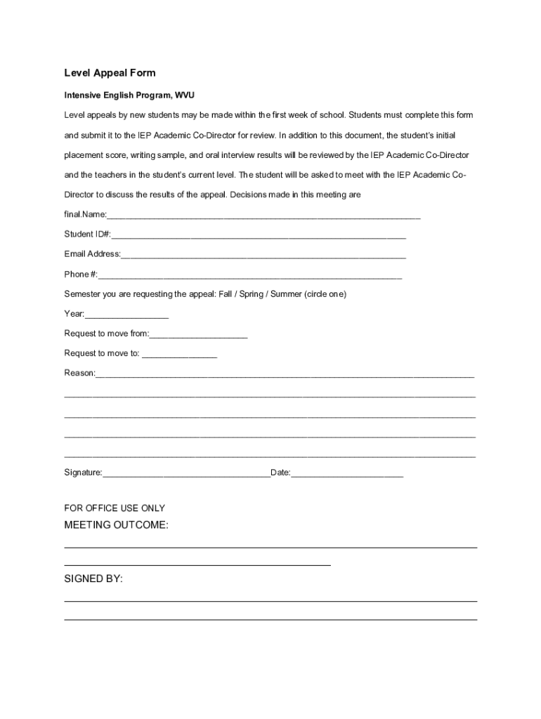 Level Appeal Form Intensive English Program, WSU Level appeals by new students may be made within the first week of school. Students must complete this form and submit it to the IEP Academic Co-director