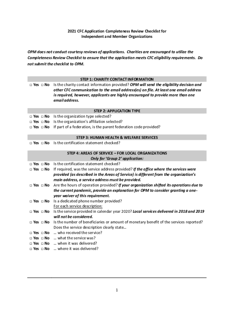 2021 CFC Application Completeness Review Checklist for Independent and Member Organizations OPM does not conduct courtesy reviews of applications. Charities are encouraged to utilize the Completeness