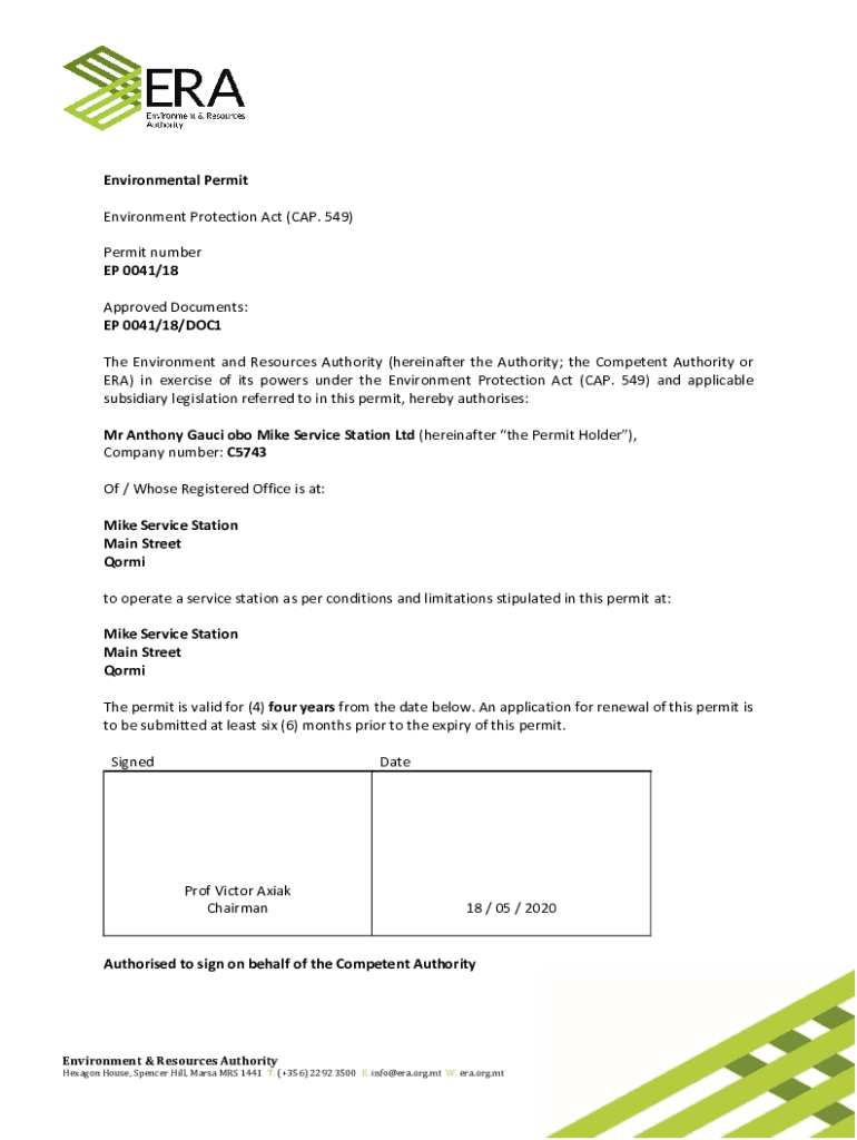 Environmental Permit Environment Protection Act (CAP. 549) Permit number EP 0041/18 Approved Documents: EP 0041/18/DOC1 The Environment and Resources Authority (hereinafter the Authority; the Competent