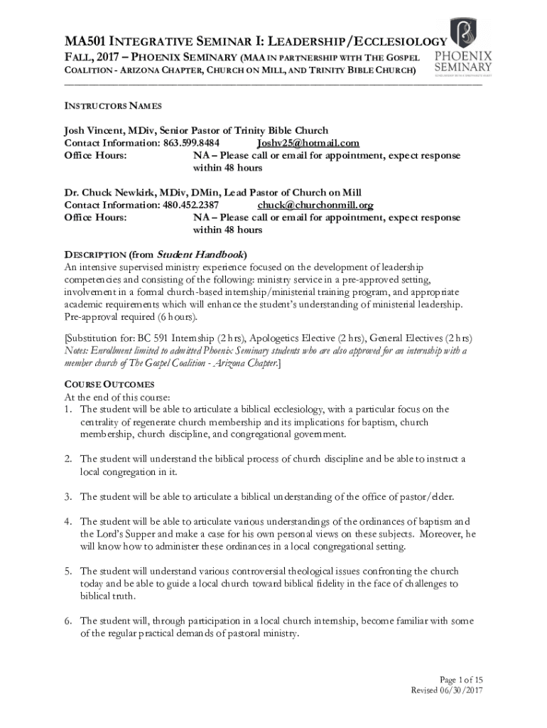 MA501 INTEGRATIVE SEMINAR I: LEADERSHIP/ECCLESIOLOGY FALL, 2017 PHOENIX SEMINARY (MAY IN PARTNERSHIP WITH THE GOSPELCOALITION ARIZONA CHAPTER, CHURCH ON MILL, AND TRINITY BIBLE CHURCH) ___INSTRUCTORS