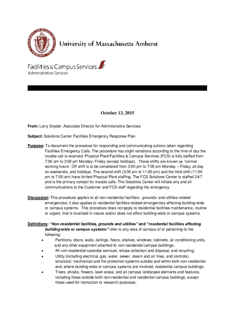 October 13, 2015, From: Larry Snyder, Associate Director for Administrative Services Subject: Solutions Center Facilities Emergency Response Plan Purpose: To document the procedure for responding