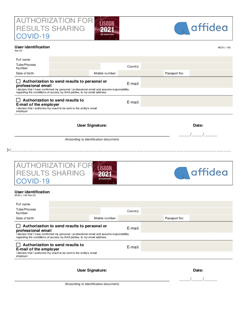 AUTHORIZATION FOR RESULTS SHARING COVID-19 User identificationMODL100Rev.00Full name: Tube/Process Number:Country:Date of birth:Mobile number:Authorization to send results to personal or professional