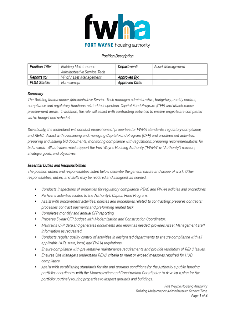 Position Description Position Title: Reports to: FLEA Status:Building Maintenance Administrative Service Tech VP of Asset Management NonexemptDepartment:Asset ManagementApproved By: Approved Date:Summary