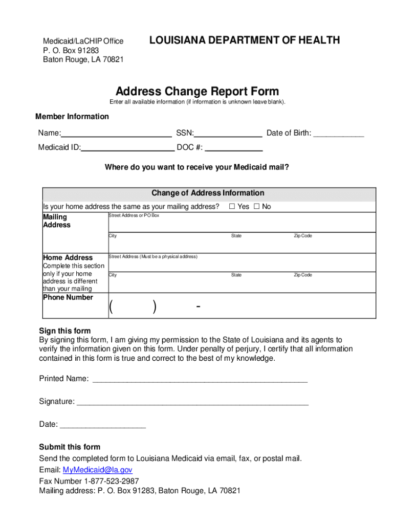 Medicaid/Lac HIP Office P. O. Box 91283 Baton Rouge, LA 70821LOUISIANA DEPARTMENT OF HEALTHAddress Change Report Form Enter all available information (if information is unknown leave blank). Member