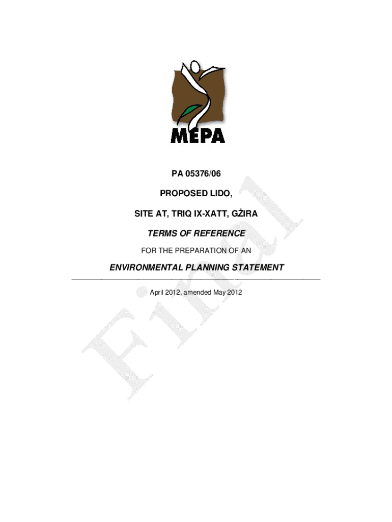 PA 05376/06 PROPOSED LIDO, SITE AT, TRIP IMPACT, GIRL TERMS OF REFERENCE FOR THE PREPARATION OF ENVIRONMENTAL PLANNING STATEMENT ___ April 2012, amended May 2012Table of Contents 1.0 1.1 1.2 1.3DESCRIPTION