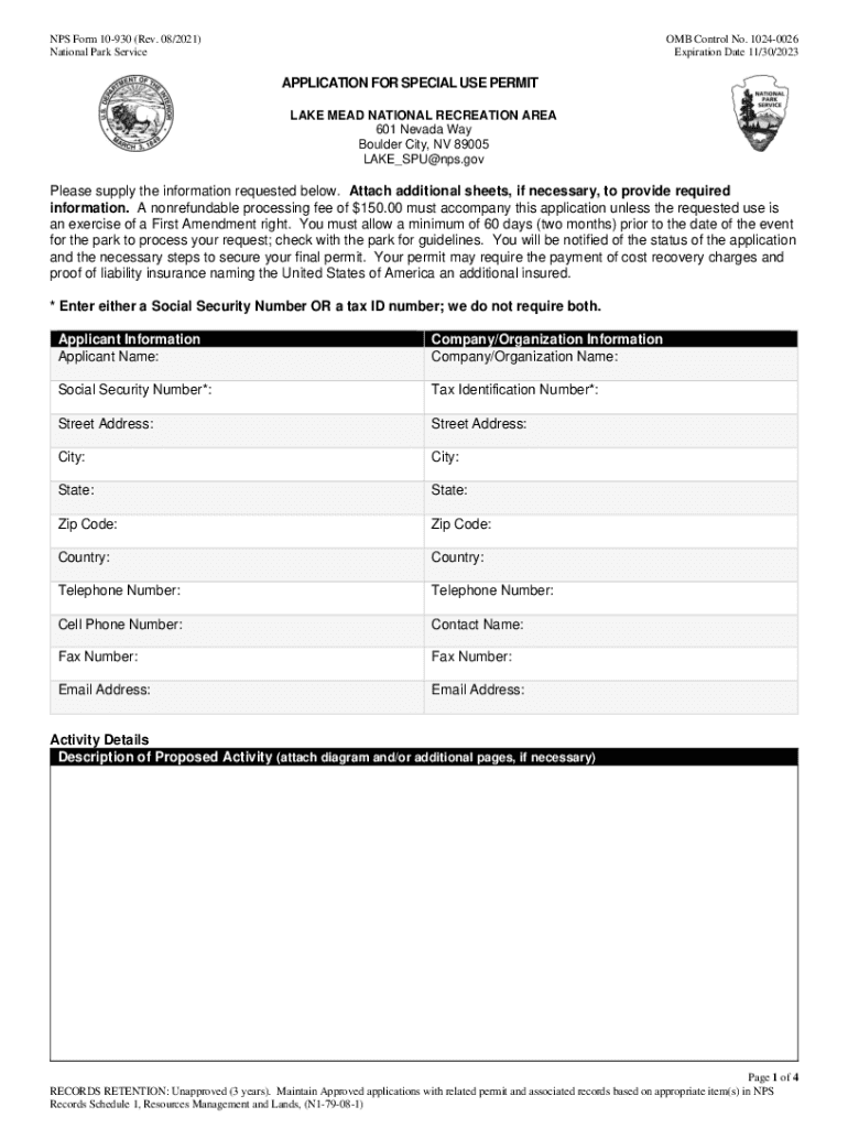 NPS Form 10930 (Rev. 08/2021) National Park Service OMB Control No. 10240026 Expiration Date 11/30/2023APPLICATION FOR SPECIAL USE PERMIT LAKE MEAD NATIONAL RECREATION AREA 601 Nevada Way Boulder