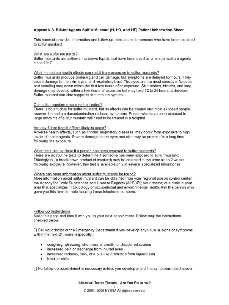 Appendix 3. Blister Agents Sulfur Mustard (H, HD, and HT) Patient Information Sheet This handout provides information and followup instructions for persons who have been exposed to sulfur mustard.