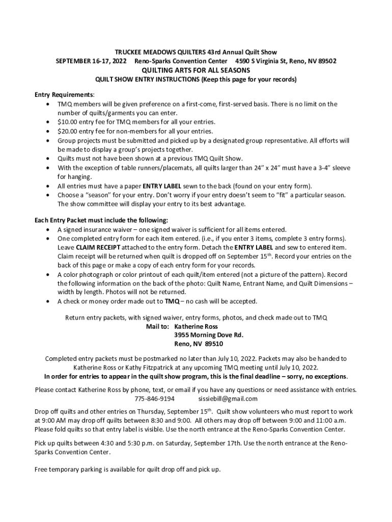 TRUCKEE MEADOWS QUILTERS 43rd Annual Quilt Show SEPTEMBER 1617, 2022 Reno Sparks Convention Center 4590 S Virginia St, Reno, NV 89502QUILTING ARTS FOR ALL SEASONS QUILT SHOW ENTRY INSTRUCTIONS (Keep