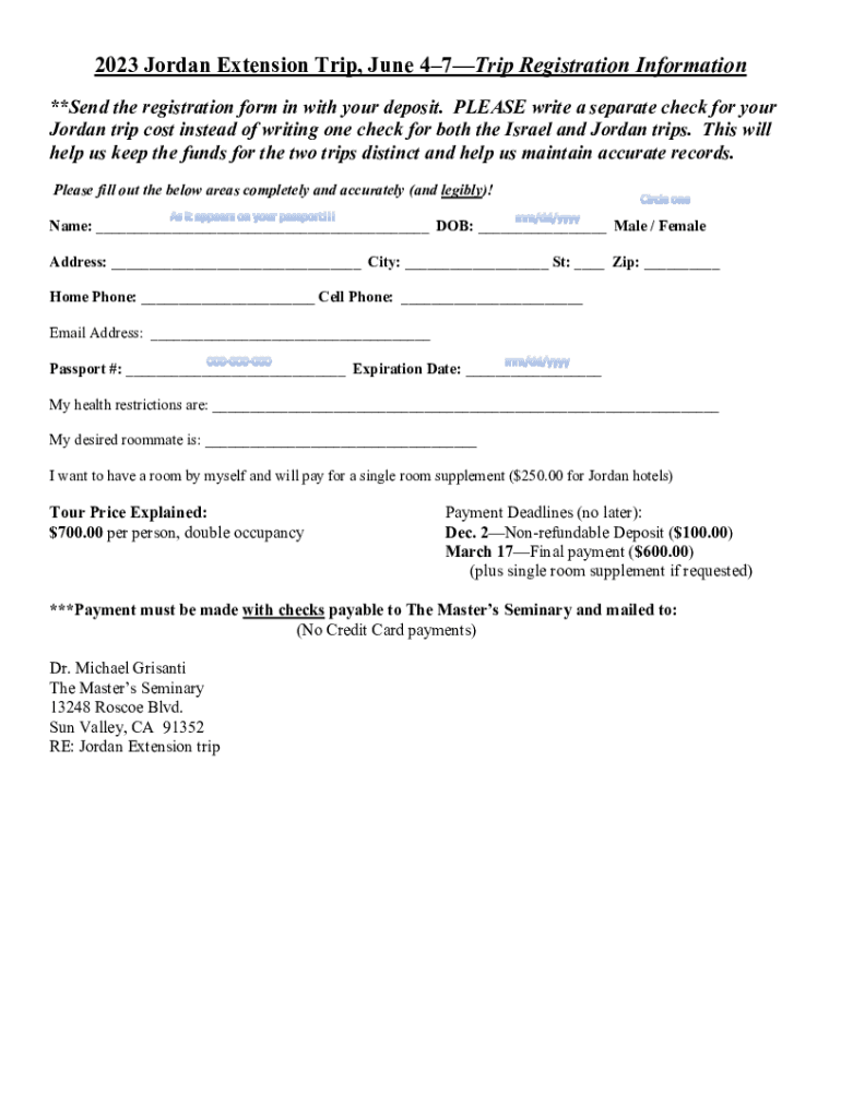 2023 Jordan Extension Trip, June 47Trip Registration Information **Send the registration form in with your deposit. PLEASE write a separate check for your Jordan trip cost instead of writing one check