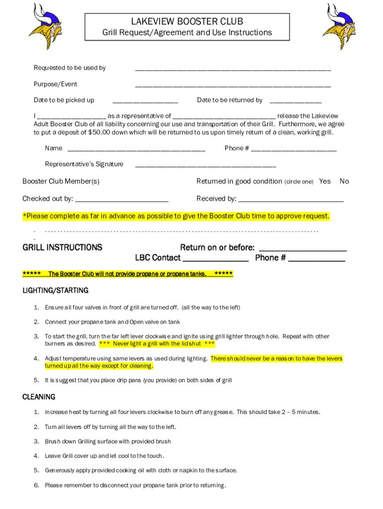 Grill Request/Agreement and Use InstructionsRequested to be used by___Purpose/Event___Date to be picked up___Date to be returned by___I ___ as a representative of ___ release the