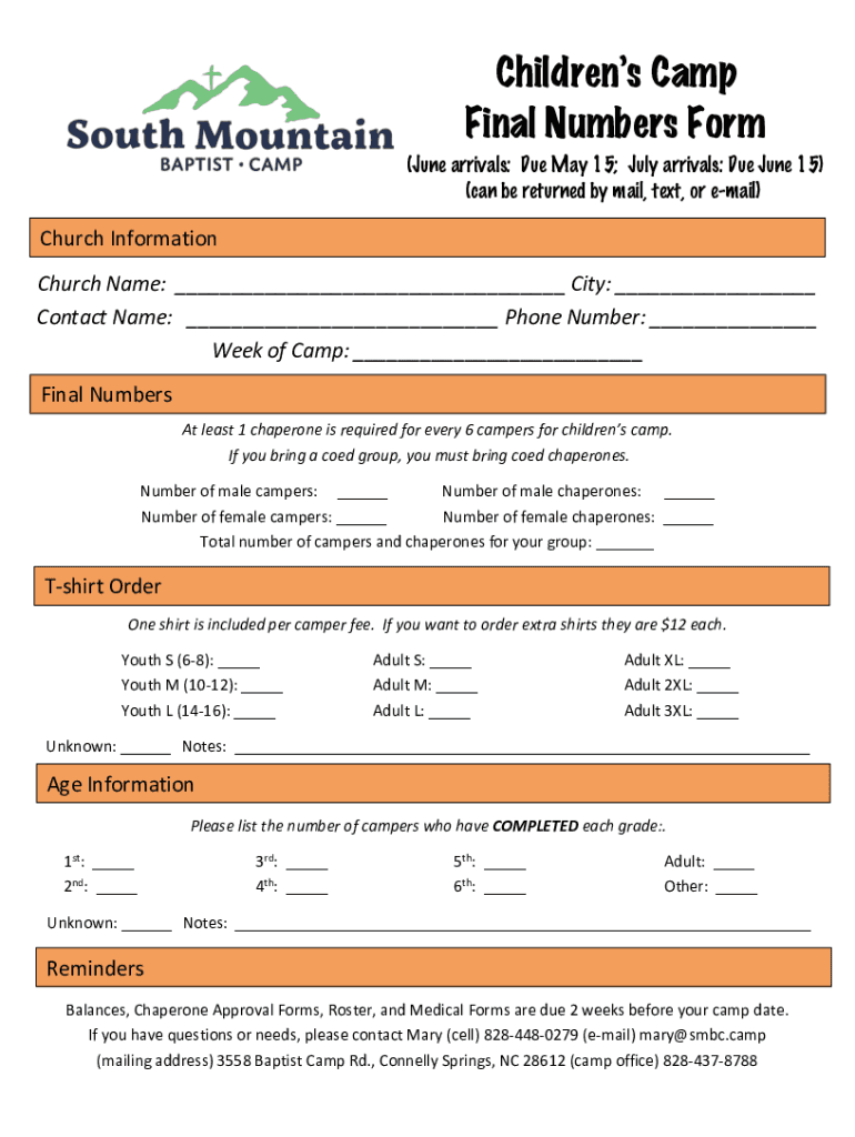 Children's Camp Final Numbers Form (June arrivals: Due May 15; July arrivals: Due June 15) (can be returned by mail, text, or email)Church Information Church Name: ___ City: ___ Contact Name: ___